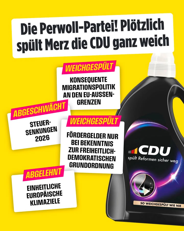 🧼 Perwoll-Partei CDU? Wenn es um wirtschaftliche Reformen geht, scheint das der Fall zu sein. Viele Reformanträge, die auf dem Bundesparteitag der CDU in zwei Wochen diskutiert werden sollten, wurden bereits im Vorfeld „weichgespült“. Echte Reformen für alle, die hart arbeiten und sich etwas aufbauen wollen, gibt es nur mit uns. 💛 ➡️ Für Entlastungen, ein modernes Arbeitsrecht, Kapitaldeckung in den sozialen Sicherungssystemen und Bürokratieabbau. 🗽Unsere Forderungen im Überblick findet ihr auf fdp.de/wirtschaftsagenda Quelle: BILD, 11.2.2026